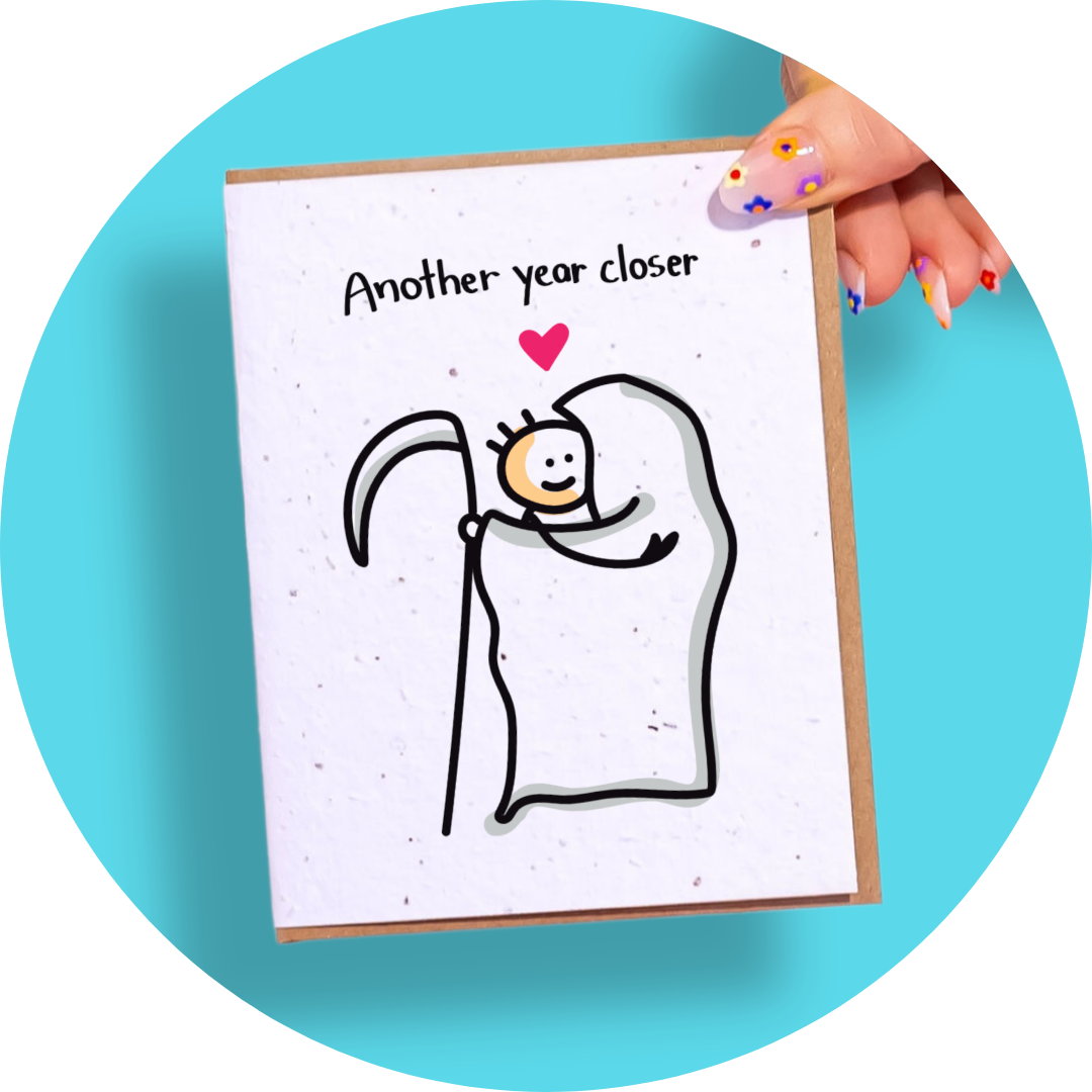 For dark-humoured friends lovingly wishing their loved ones well on "Another year closer", and people with a good sense of humour who want to give a green greeting card. Maybe not the one to buy for your Mom.