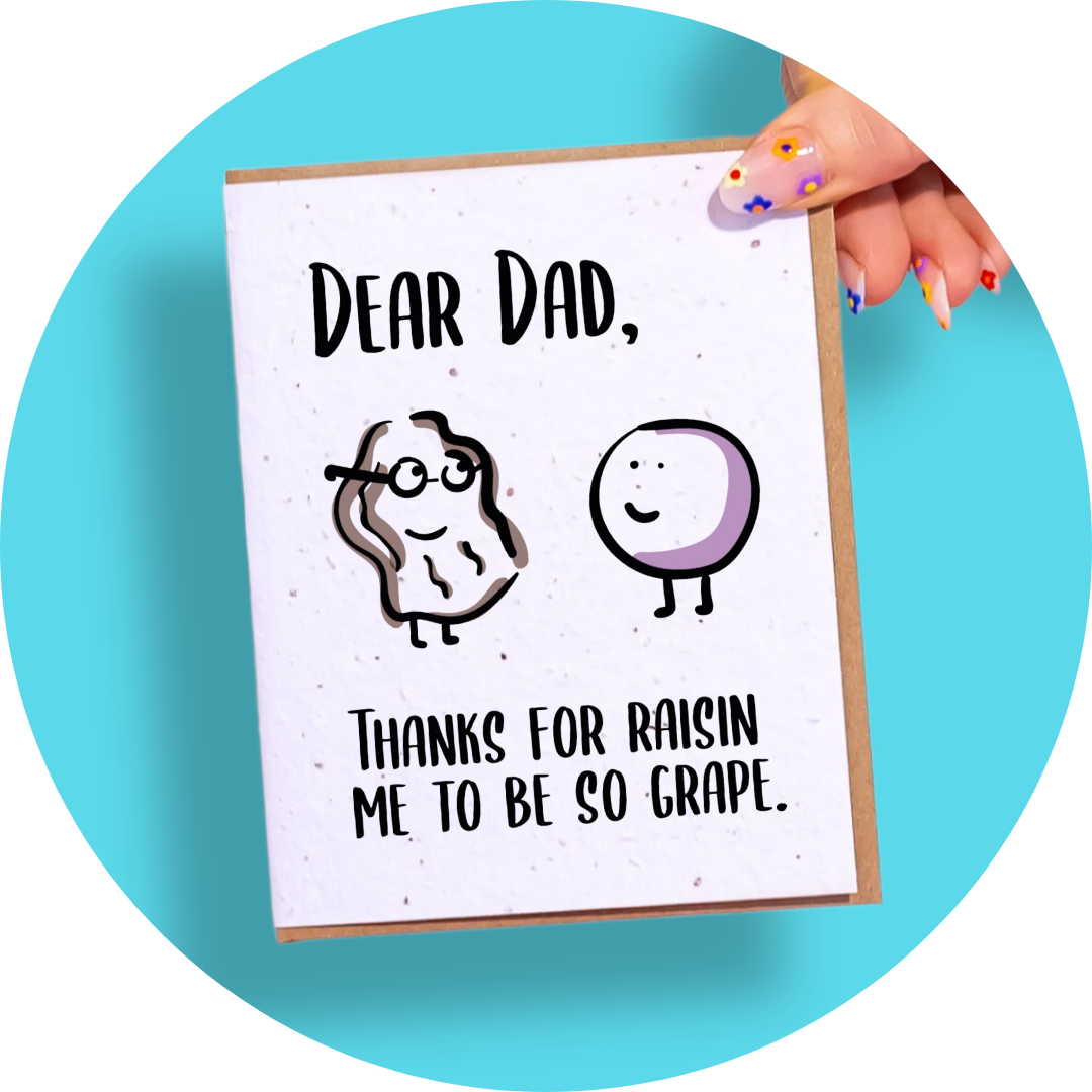 Say 'Happy Father's Day' with a punny twist! Say it with 'Grape Dad' – this plantable greeting card is bursting with fatherly love. Raisin a smile from Dad, this card is the perfect heartfelt way to show your grape appreciation!