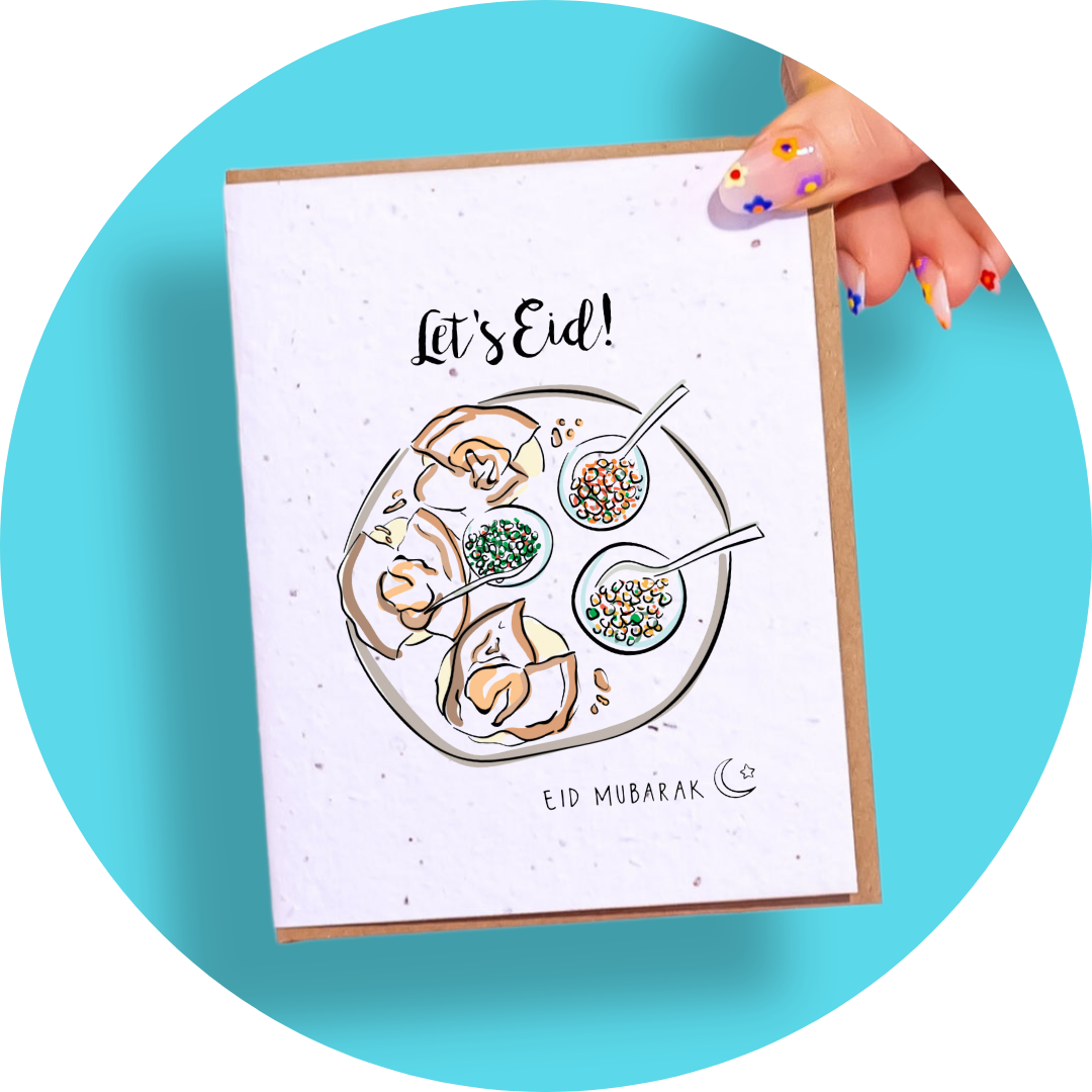 Let's Eid in style this year! Celebrate with a unique, plantable greeting card and feast your eyes with this beautiful design inspired by Eid. Send good vibes and nature's blessing with this eco-friendly card that will keep on giving!