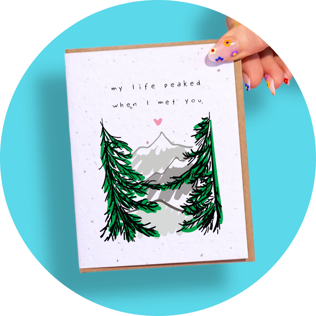 Send your love soaring to new heights with Life Peaked! Our unique SowSweet plantable greeting card takes sweet puns and humour to the next level—inspired by the beautiful West Coast of Canada's. With wildflower seedpaper, evergreen mountains, and love all in one, Life Peaked is a peak experience. Get planting!