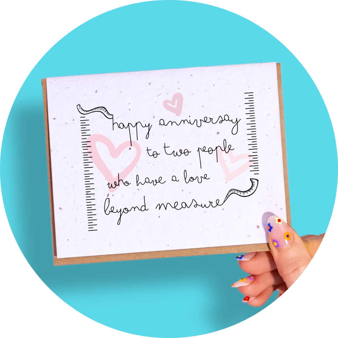 Make a dynamic duo you know smile and spread love beyond measure with this plantable, Canadian greeting card! Featuring wildflower seedpaper and sweet puns, Love Beyond Measure is the perfect way to commemorate anniversaries, marriages, or any kind of love. Send some smiles and seeds today!
