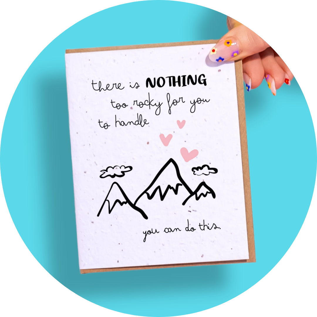 Send your loved ones some sympathy and motivation straight from the majestic Canadian Rockies with our Nothing Too Rocky plantable greeting card! These cards come with a healthy dose of inspiration and a tribute to the great outdoors. Plus, they include seeds so the recipient can watch their own little piece of nature grow! (You can't get more Canadian than that!)