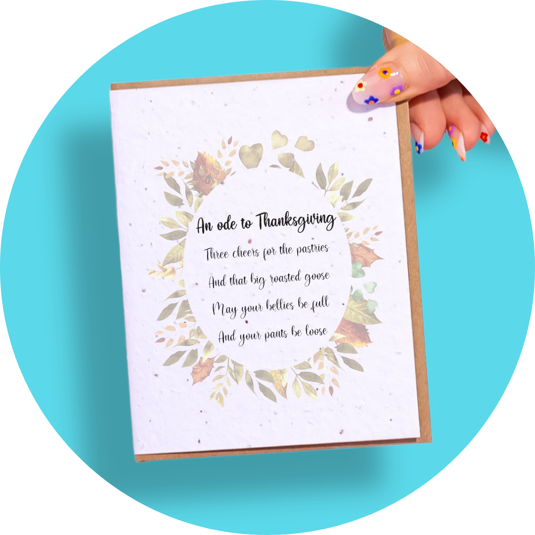 Say "thanks" in style with the Ode to Thanksgiving plantable greeting card! This unique card features beautiful artwork celebrating the season of giving, and its plantable paper base means that instead of ending up in the bin, the card will continue to bloom with a little love and care. Show someone special that you're truly thankful for them!