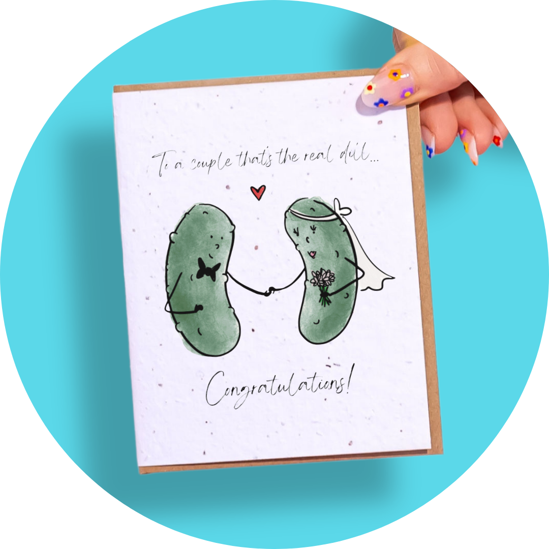 Send your congrats to the happy couple with this Real Dill greeting card! It's the perfect pun-filled way to show your love and makes a great addition to any romantic occasion. Plus, it comes with a seed paper heart, so you can watch your message grow!