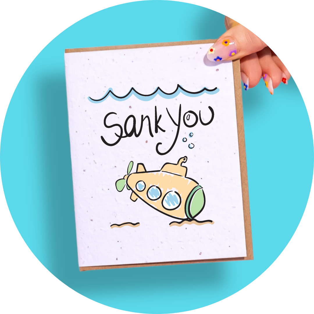 Say "Sank You" for a thank-you like no other! This plantable greeting card features an adorable submarine pun that will be sure to leave your loved one feeling really appreciated! Pop the card into the ground and watch your appreciation grow!