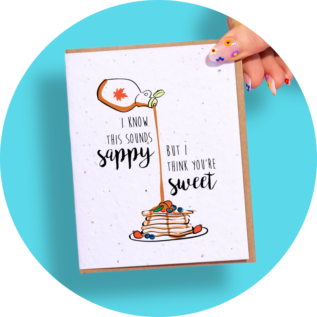 Unlock a world of sweetness - with Sappy + Sweet! This plantable greeting card is guaranteed to make your loved one's day with its cute pancakes pun. Put a little nature in their life with green, growing joy! Deliciously punny, beautifully cute.